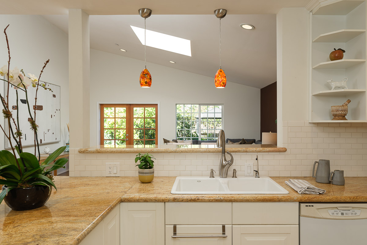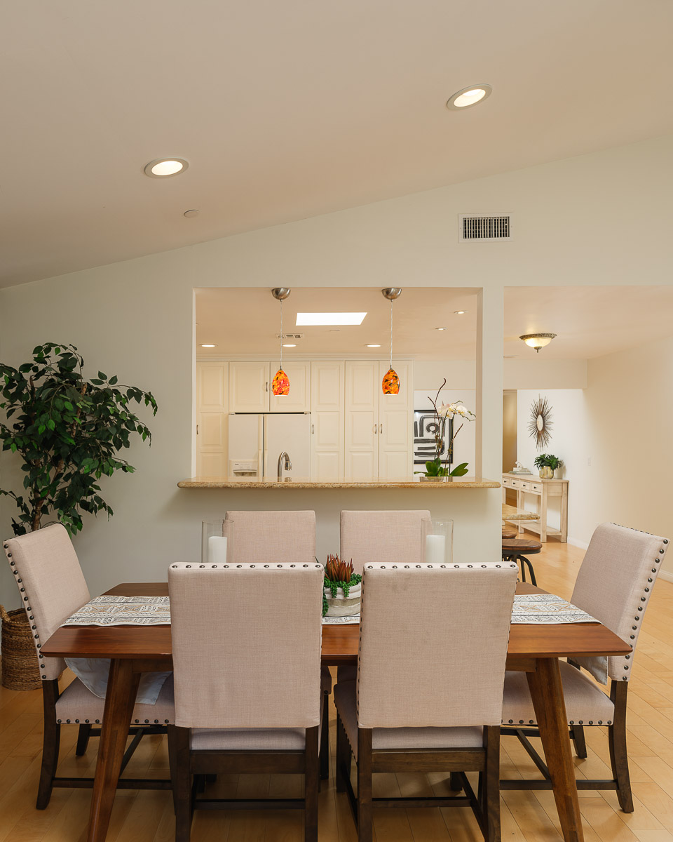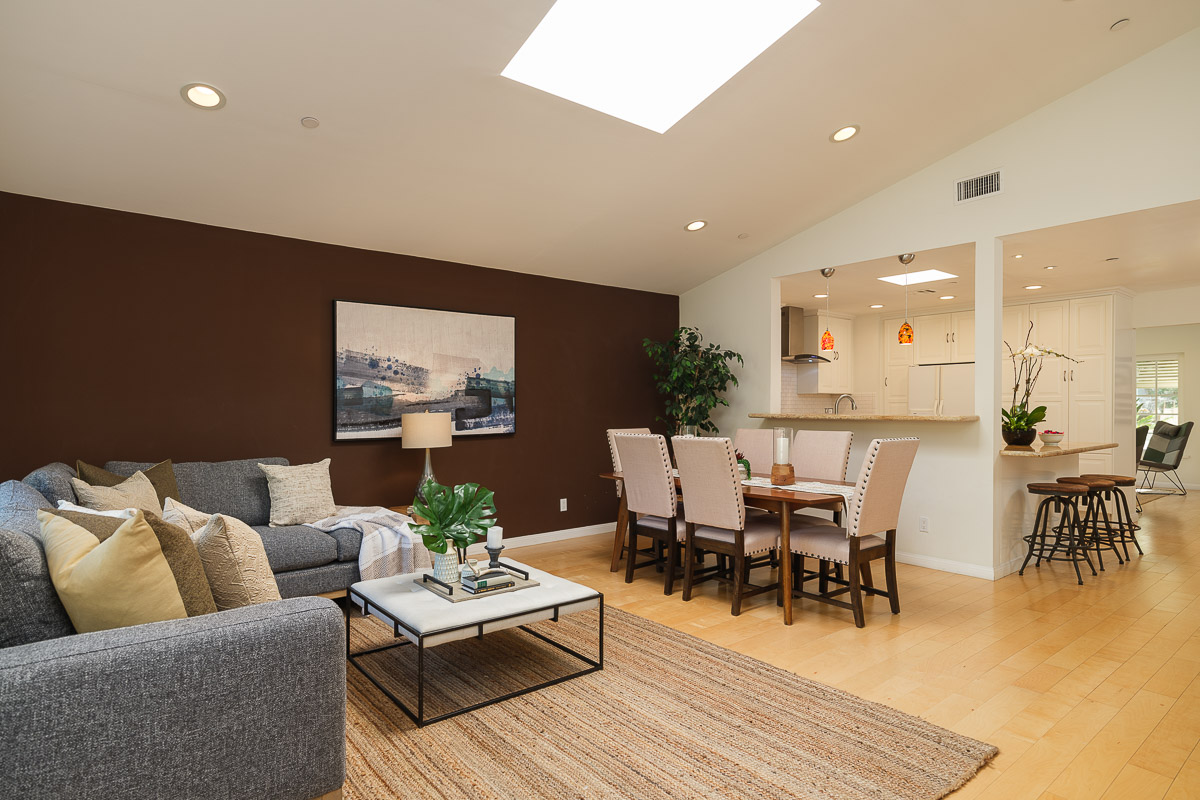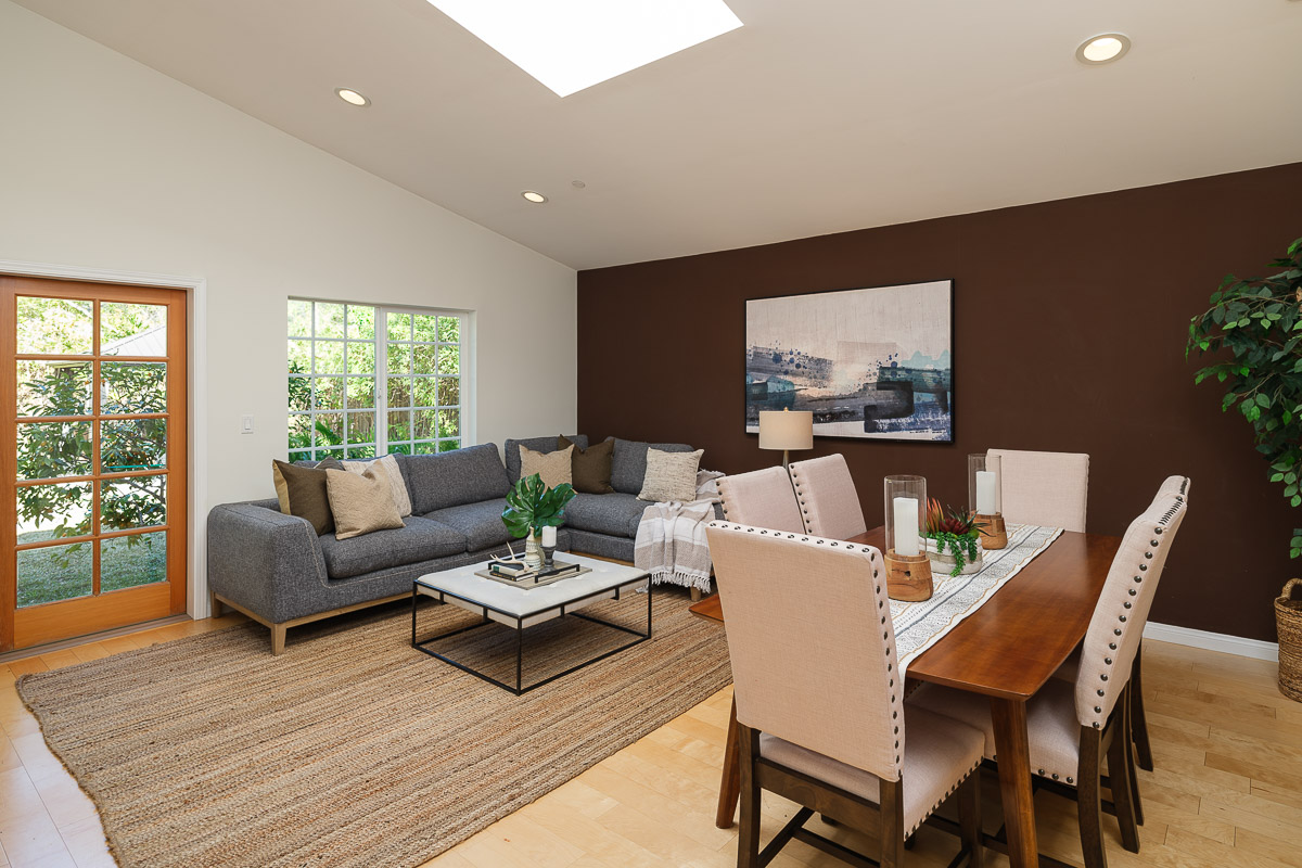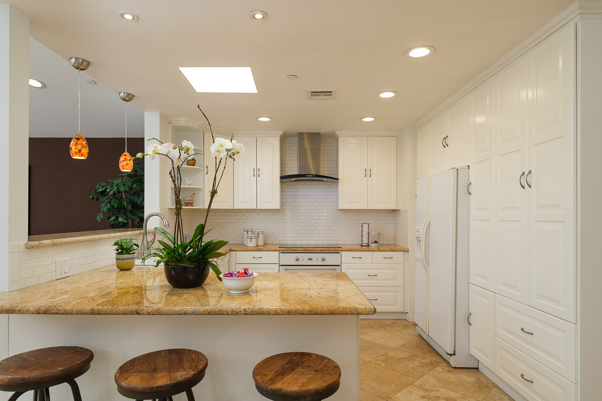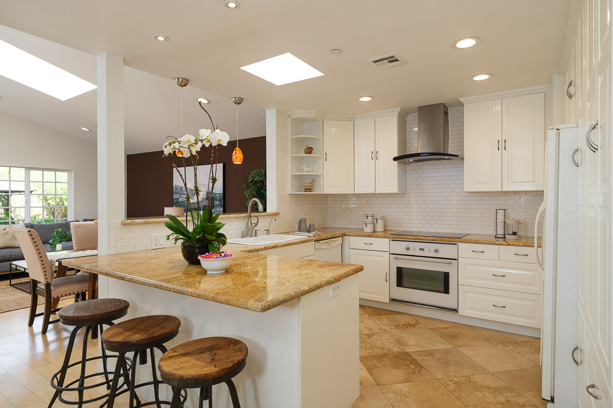 There is a spacious living room, a sunlit family room with a vaulted ceiling, a beautifully remodeled kitchen that features granite counters, handcrafted cabinetry, a breakfast bar, a chef’s peninsula and stainless steel fixtures. This all looks out at the adjacent dining area that is equally ideal for family dinners or large celebrations with friends.