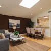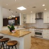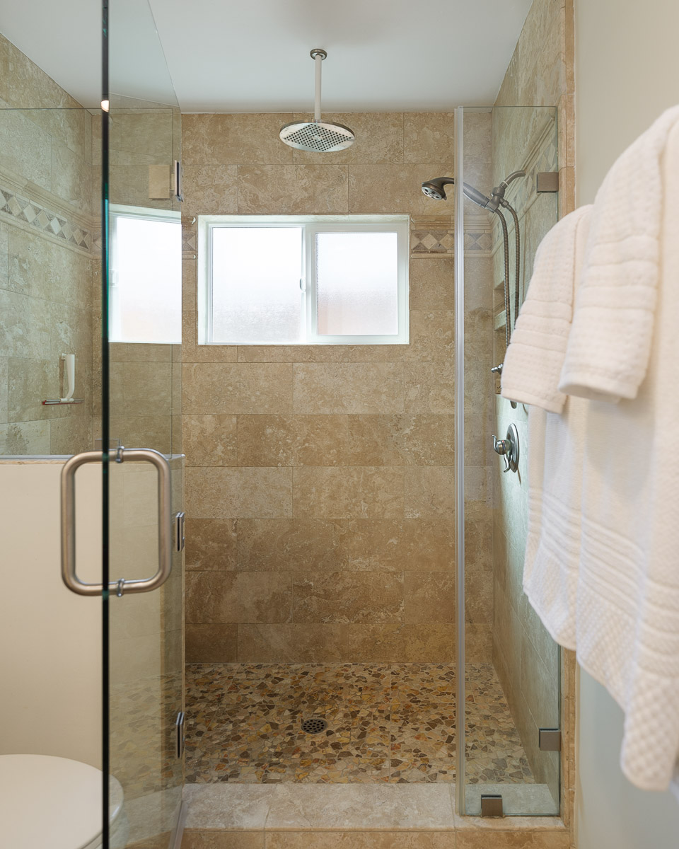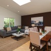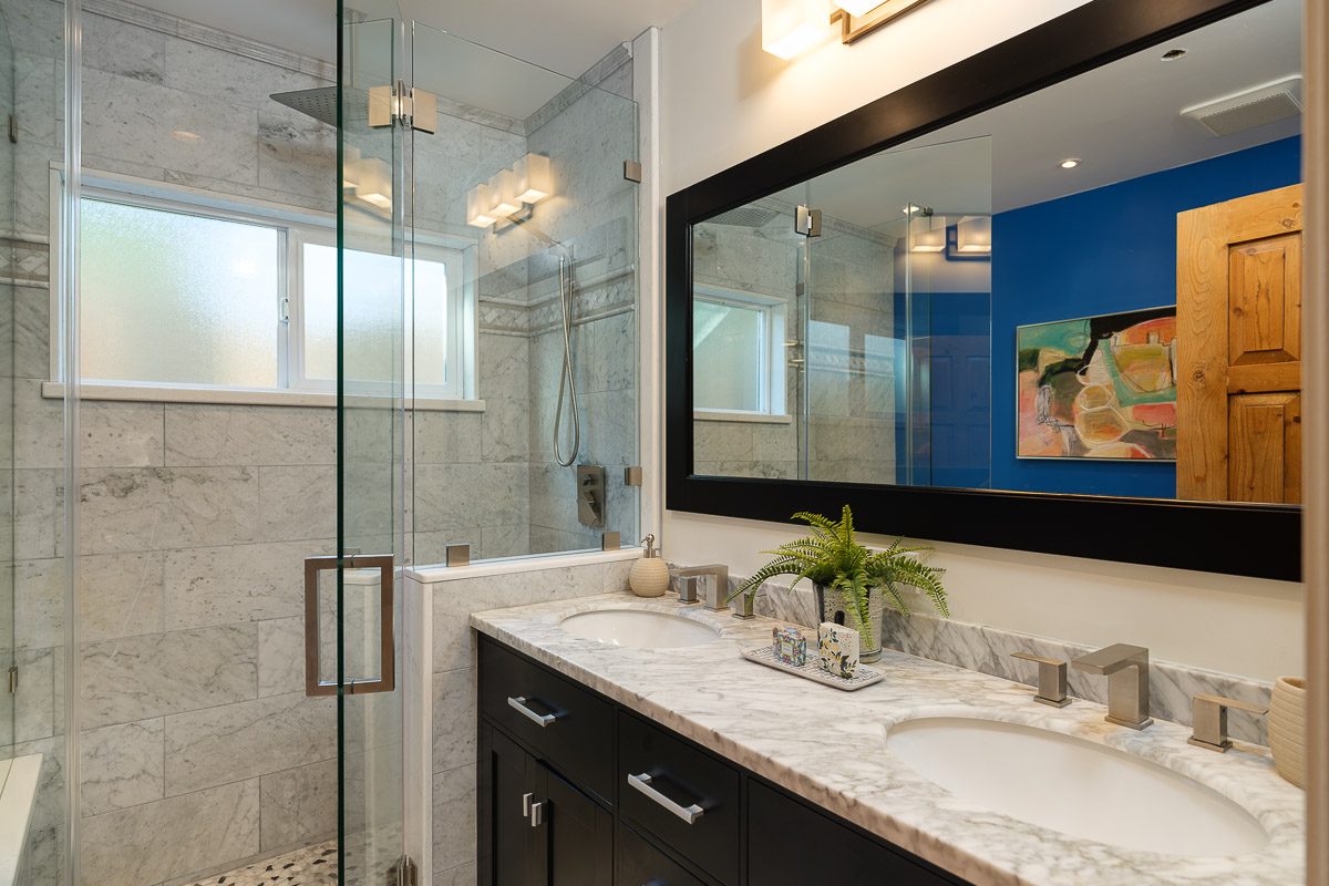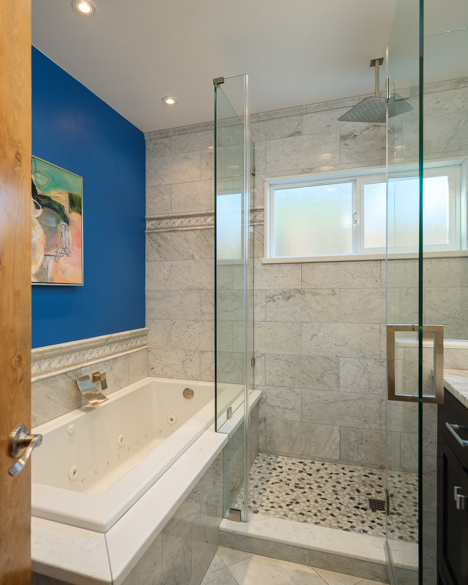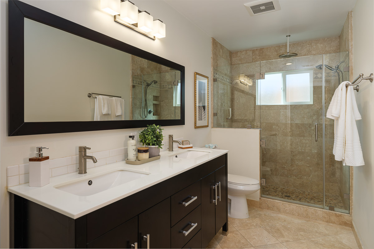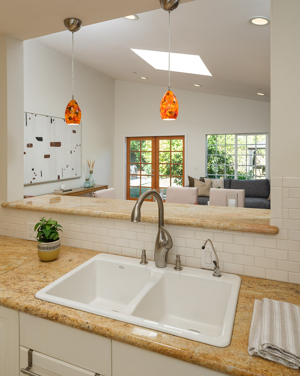 There is a spacious living room, a sunlit family room with a vaulted ceiling, a beautifully remodeled kitchen that features granite counters, handcrafted cabinetry, a breakfast bar, a chef’s peninsula and stainless steel fixtures. This all looks out at the adjacent dining area that is equally ideal for family dinners or large celebrations with friends.